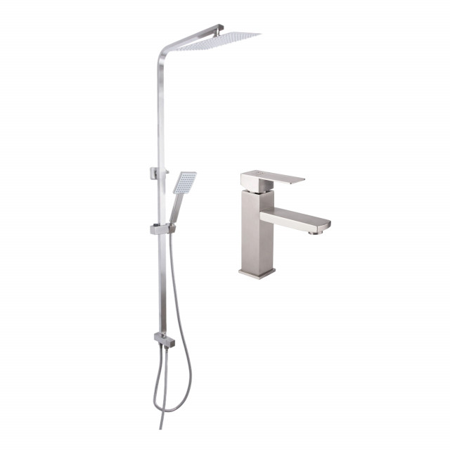 Акционный набор: Lidz Kubis 001F Смеситель для раковины (k35) Nickel + Lidz Kubis 1120 Душевая стойка универсальная на два потребителя Nickel